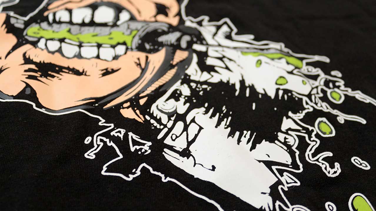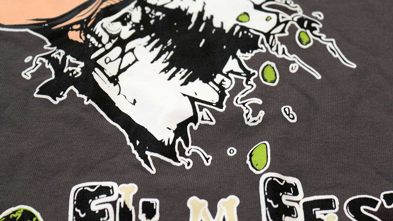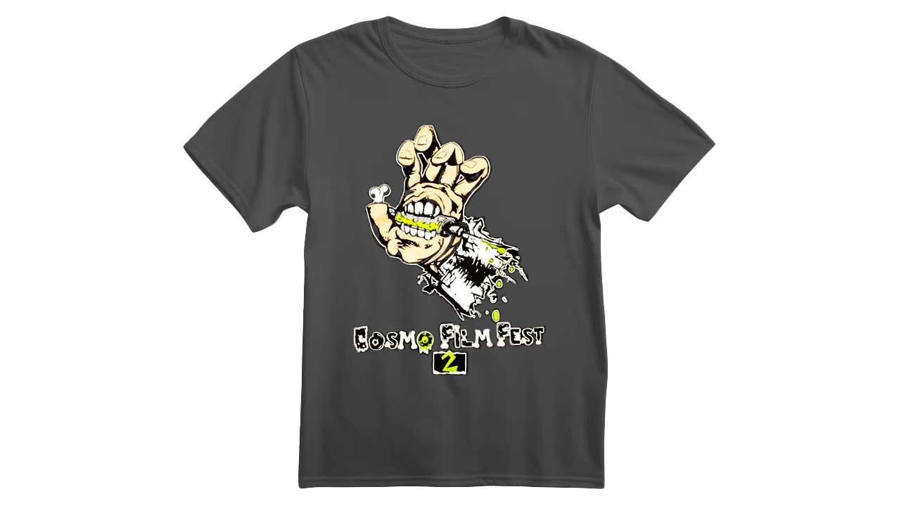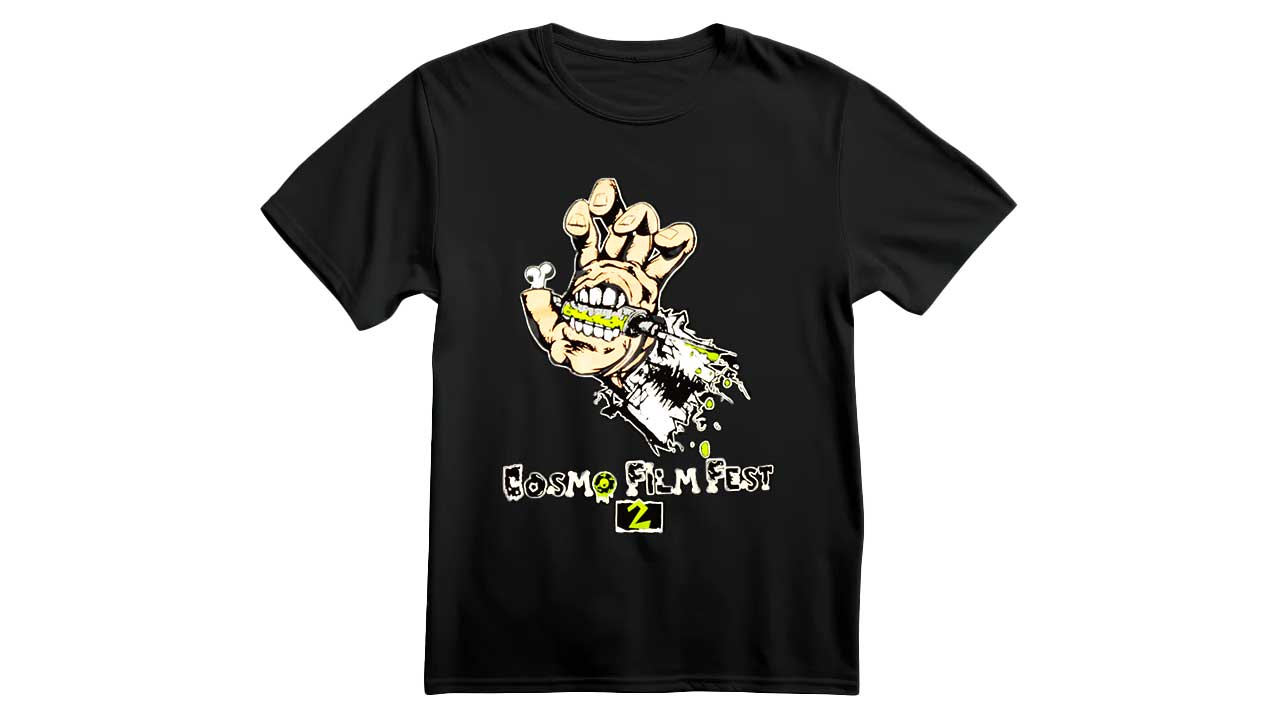 La playera Cosmo Film Fest 2024 está disponible en dos versiones: negro clásico y gris oscuro. El diseño es brutal: una mano mutante que muerde una barra de metal, con una explosión gráfica que refleja el caos visual del festival. Abajo, el logo “Cosmo Film Fest 2” aparece en una tipografía tipo slime/deteriorada, con un toque punk que resume perfectamente la experiencia.
